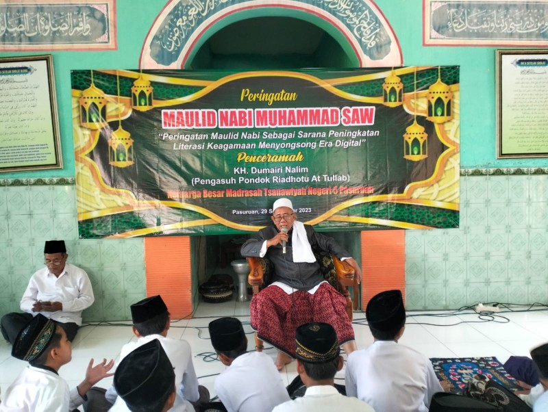Memperingati Maulid Nabi Muhammad SAW 12 Rabiul Awal 1445, MTSN 5 Pasuruan mengundang tokoh masyarakat untuk memberikan ceramah agama Bapak KH. Dumairi Nalim pengasuh pondok pesantren Riyadotut Tulab Lekok dan berbagi cerita dengan para siswa dan guru. Tentang perjuangan Nabi Muhammad.