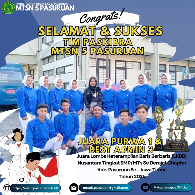 Kab. Pasuruan (MTsN 5) – Paskibra Kopastim MTsN 5 Pasuruan berhasil meraih juara Purwa 1 dan best administrasi 3 pada lomba Lomba keterampilan baris berbaris (LKBB) tingkat Jawa Timur yang diadakan oleh BRAMASTA MANAGEMENT