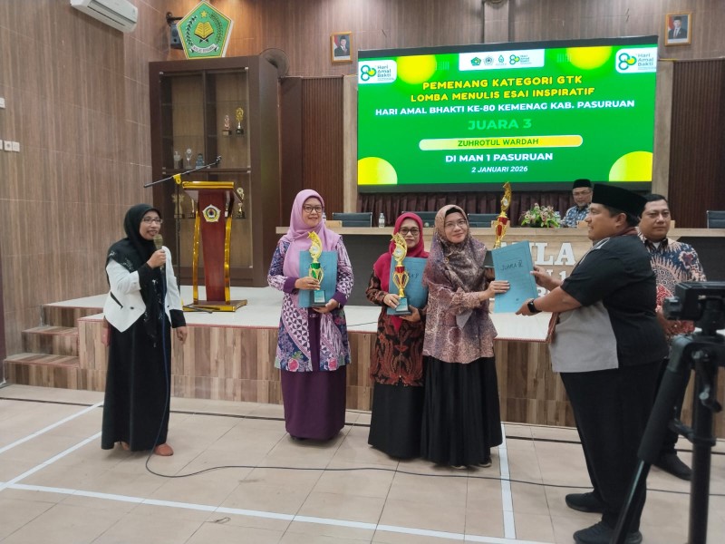 Pasuruan, 2 Januari 2026 — Prestasi membanggakan kembali ditorehkan oleh keluarga besar MTs Negeri 5 Pasuruan di awal tahun 2026. Salah satu guru IPA, Zuhrotul Wardah, berhasil meraih Juara 3 Lomba Esai yang diselenggarakan oleh Kementerian Agama Kabupaten Pasuruan dalam rangka memperingati rangkaian Hari Amal Bakti (HAB) Kementerian Agama.