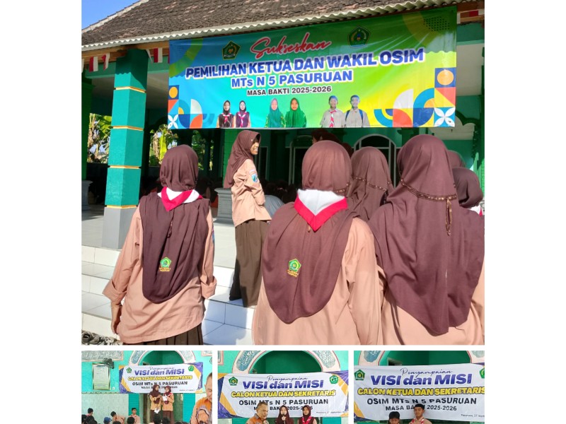 Pasuruan, 27 September 2025 – MTsN 5 Pasuruan melaksanakan kegiatan penyampaian visi dan misi calon ketua serta wakil ketua OSIM (Organisasi Siswa Intra Madrasah) periode 2025/2026. Kegiatan berlangsung di masjid madrasah setelah pelajaran BTQ hingga pukul 08.00 WIB. Acara dibuka ...